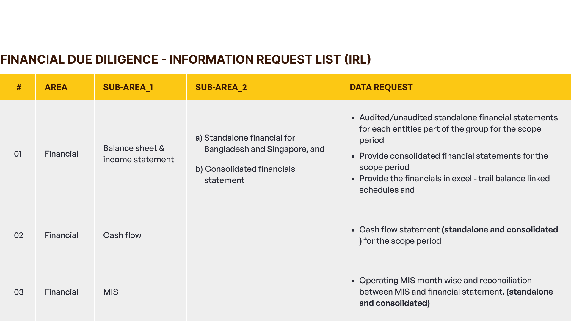 In practice, investors typically move through a data room sequentially, starting with financial statements and then drilling into revenue, cost drivers, and finally ownership and contingencies. Preparation should mirror that sequence.